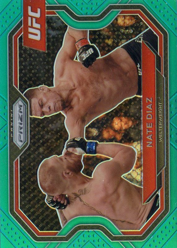 This card is 1 of 27 Nate Diaz's card variations in the 2021 Prizm UFC set being tracked by Sports Card Investor, including Base, Green, Octagon Signatures, Octagon Signatures - Green, and Octagon Signatures - Silver.