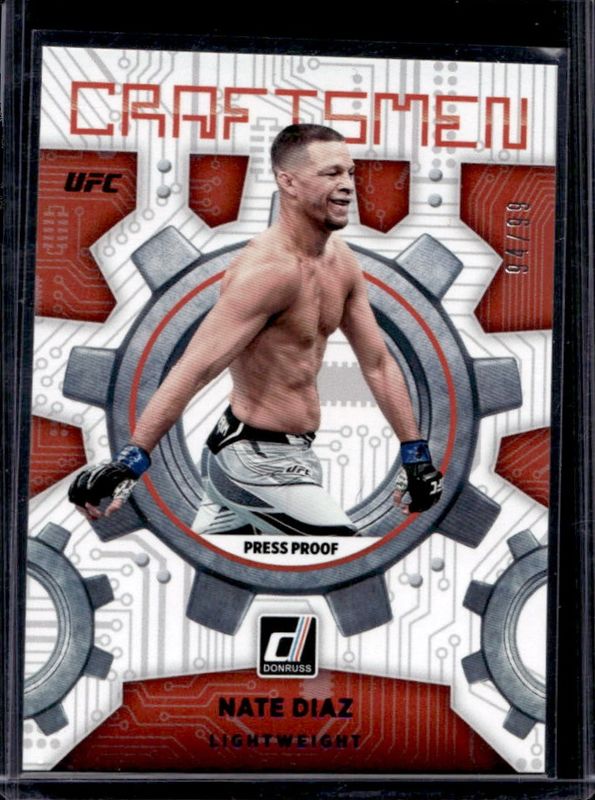 The Nate Diaz 2022 Donruss UFC #7 Craftsmen Press Proof Purple /99 card is 1 of 57 Nate Diaz's card variations in the 2022 Donruss UFC set being tracked by Sports Card Investor, including Base, Green Flood, Holo Orange Laser, Holo Pink Laser, and Press Proof Purple.