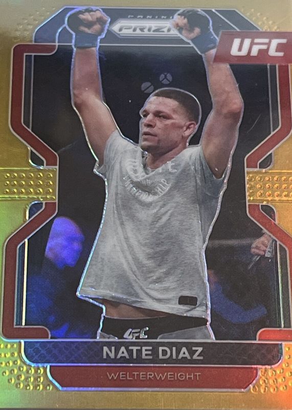 The Nate Diaz 2022 Prizm UFC #150 Gold /10 card in Raw condition has not changed in price in the last 30 days and was last sold for $112.50 .