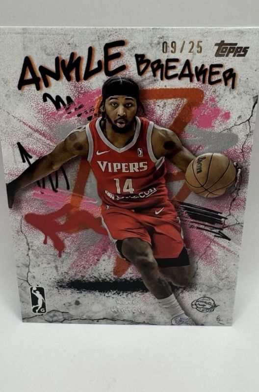 The Nate Hinton 2024 Topps G-League #AB-14 Ankle Breaker - Pink /25 card is 1 of 21 Nate Hinton's card variations in the 2024 Topps G-League set being tracked by Sports Card Investor, including Ankle Breaker, Ankle Breaker - Blue, Base Chrome, Base Chrome - Refractor, and Take it to the Rack.