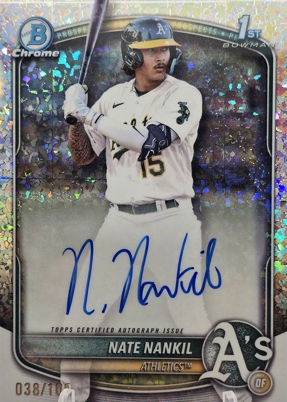 The Nate Nankil 2025 Bowman #CPA-NN Chrome Prospect Auto - Mini Diamond Refractor /100 (1st) card in Raw condition has not changed in price in the last 30 days and was last sold for $11.50 .
