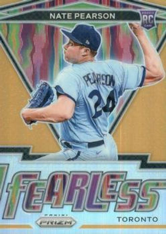 The Nate Pearson 2021 Prizm #FR-2 Fearless - Neon Orange /100 Rookie card is 1 of 111 Nate Pearson's card variations in the 2021 Prizm set being tracked by Sports Card Investor, including Base, Blue, Blue Velocity, Carolina Blue, and Cosmic Haze.