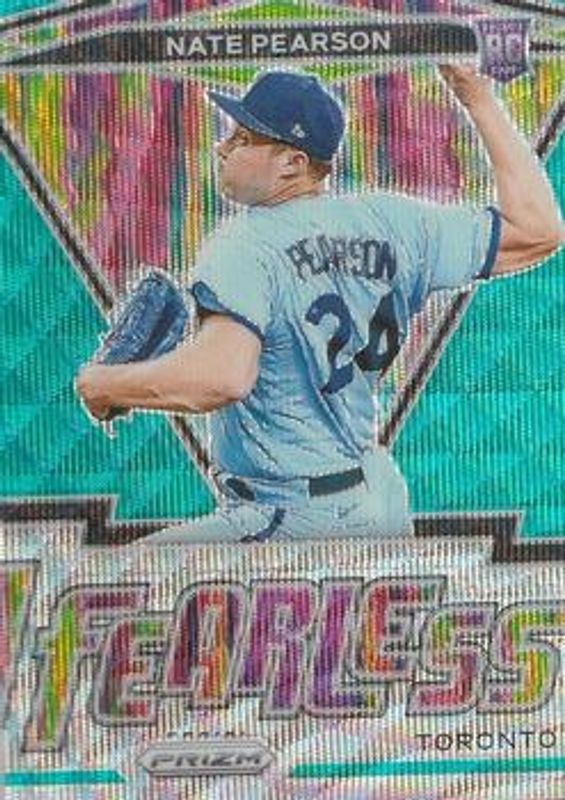 The Nate Pearson 2021 Prizm #FR-2 Fearless - Teal Wave Rookie card is 1 of 111 Nate Pearson's card variations in the 2021 Prizm set being tracked by Sports Card Investor, including Base, Blue, Blue Velocity, Carolina Blue, and Cosmic Haze.