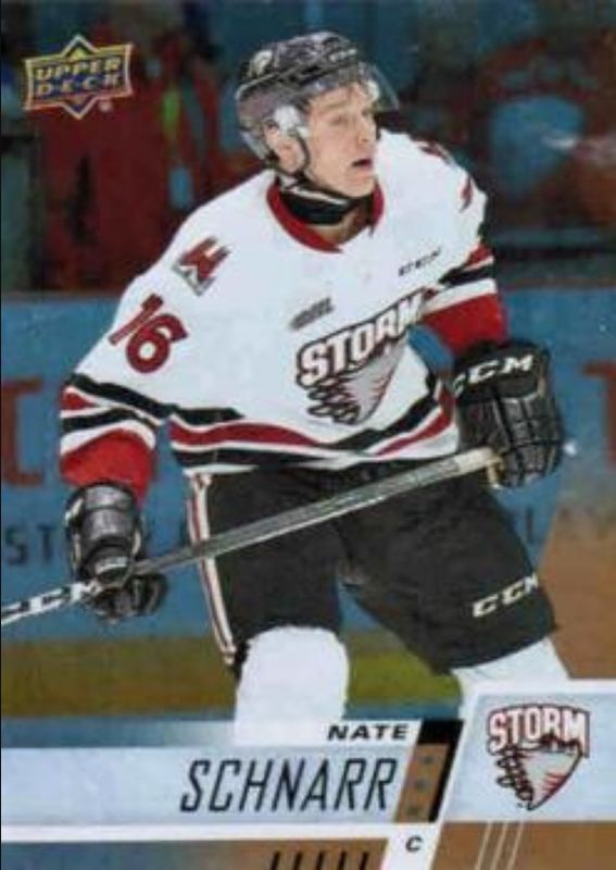 The Nate Schnarr 2017 Upper Deck CHL #85 Rainbow card is 1 of 7 Nate Schnarr's card variations in the 2017 Upper Deck CHL set being tracked by Sports Card Investor, including Base, Red Bordered, Printing Plates Black /1, Printing Plates Cyan /1, and Printing Plates Magenta /1.