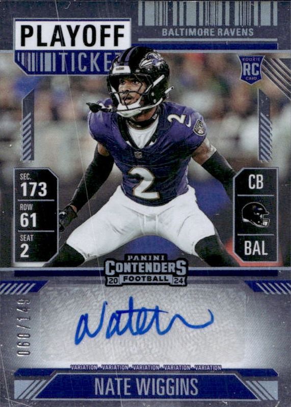 This card is 1 of 26 Nate Wiggins' card variations in the 2024 Contenders set being tracked by Sports Card Investor, including Rookie Ticket Auto, Rookie Ticket Auto - Opening Kickoff Ticket, Rookie Ticket Auto - Red Zone Ticket, Rookie Ticket Auto - Ticket Stub (/2), and Rookie Ticket Auto Variation.