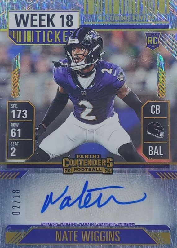 This card is 1 of 26 Nate Wiggins' card variations in the 2024 Contenders set being tracked by Sports Card Investor, including Rookie Ticket Auto, Rookie Ticket Auto - Opening Kickoff Ticket, Rookie Ticket Auto - Red Zone Ticket, Rookie Ticket Auto - Ticket Stub (/2), and Rookie Ticket Auto Variation.
