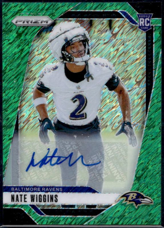 The Nate Wiggins 2024 Prizm #380 Base Autographs - Green Shimmer /5 Rookie card is 1 of 101 Nate Wiggins' card variations in the 2024 Prizm set being tracked by Sports Card Investor, including Base, Choice Blue Yellow Green, Choice Silver, Disco, and Green.