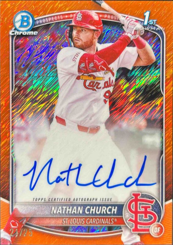 The Nathan Church 2025 Bowman Chrome #CPA-NCH Prospect Auto - Orange Shimmer Refractor /25 (1st) card in Raw condition has moved down -$58.99 (-45.4%) in the last 30 days and was last sold for $71.00 .