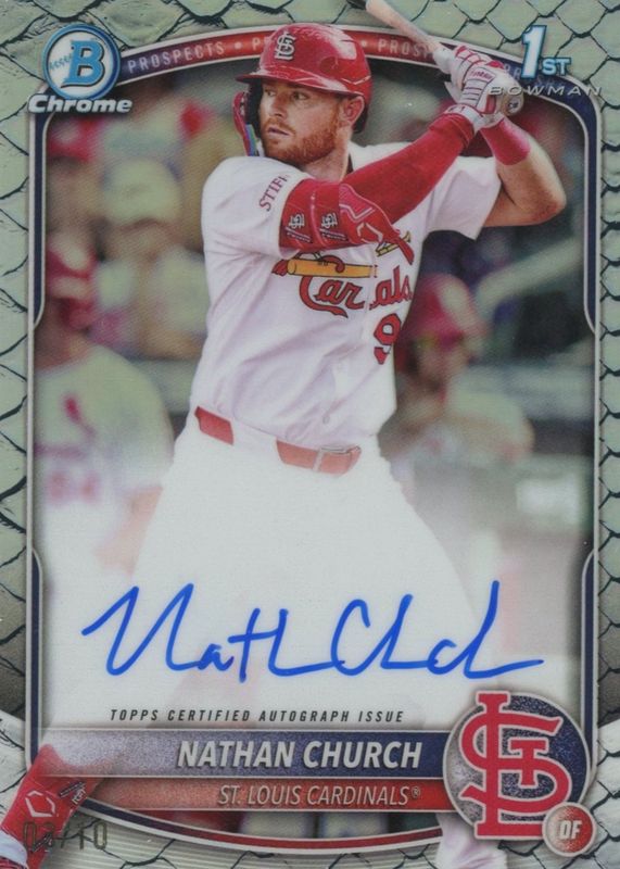 This card is 1 of 86 Nathan Church's card variations in the 2025 Bowman Chrome set being tracked by Sports Card Investor, including Prospect Auto (1st), Prospect Auto - Black & White Shimmer Refractor (1st), Prospects (1st), Prospects - Mini-Diamond Refractor (1st), and Prospects - Shimmer Refractor (1st).