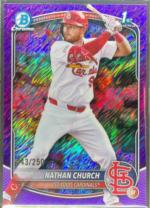 This card is 1 of 86 Nathan Church's card variations in the 2025 Bowman Chrome set being tracked by Sports Card Investor, including Prospect Auto (1st), Prospect Auto - Black & White Shimmer Refractor (1st), Prospects (1st), Prospects - Mini-Diamond Refractor (1st), and Prospects - Shimmer Refractor (1st).