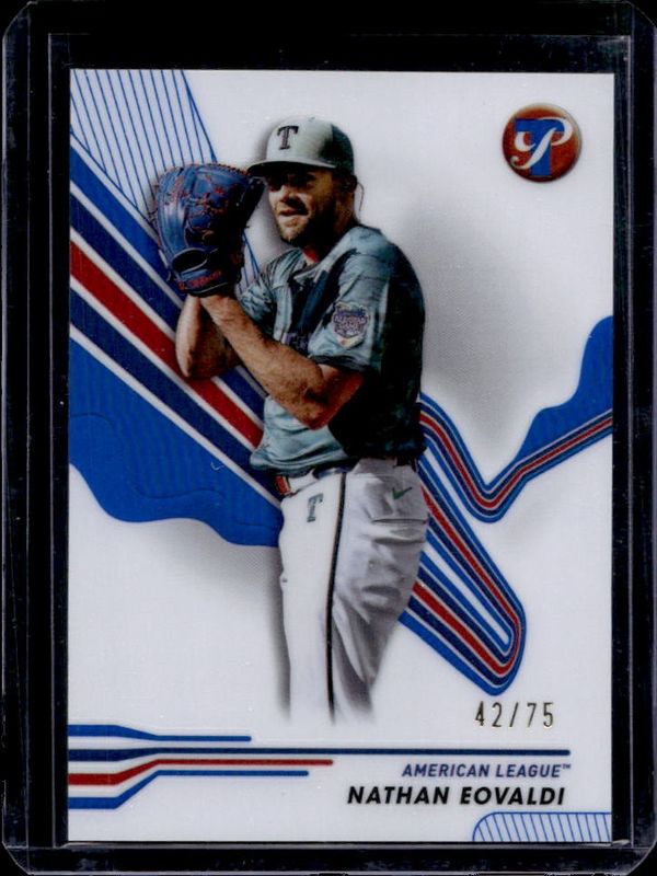 The Nathan Eovaldi 2024 Topps Pristine #261 Blue Refractor /75 card is 1 of 27 Nathan Eovaldi's card variations in the 2024 Topps Pristine set being tracked by Sports Card Investor, including Base, Pristine Refractor, Refractor, Green Refractor /150, and Pristine Purple Refractor /99.
