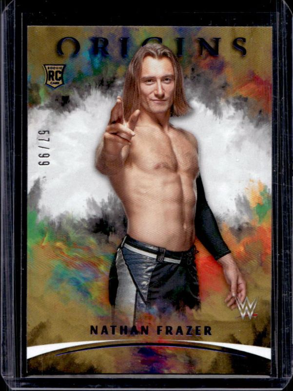 The Nathan Frazer 2022 Chronicles WWE #140 Blue /99 Rookie card is 1 of 11 Nathan Frazer's card variations in the 2022 Chronicles WWE set being tracked by Sports Card Investor, including #404 Base /99, #140 Base /99, #140 Bronze, #140 Red /199, and #140 Purple /49.