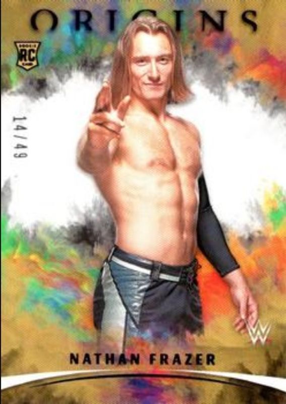 The Nathan Frazer 2022 Chronicles WWE #140 Purple /49 Rookie card is 1 of 11 Nathan Frazer's card variations in the 2022 Chronicles WWE set being tracked by Sports Card Investor, including #404 Base /99, #140 Base /99, #140 Bronze, #140 Red /199, and #140 Blue /99.