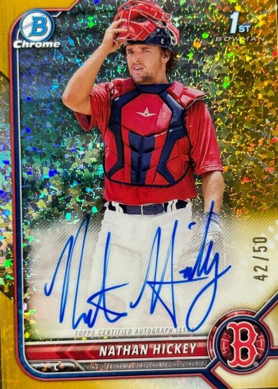 Best Prices Available For Sale of Nathan Hickey 2022 Bowman Chrome #CPA-NH Prospect Auto - Gold Mini-Diamond Refractor /50 (1st)