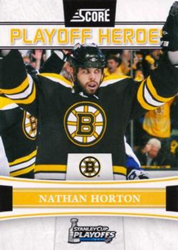 The Nathan Horton 2011 Score #5 Playoff Heroes card is 1 of 10 Nathan Horton's card variations in the 2011 Score set being tracked by Sports Card Investor, including #56 Base, #498 Base, #498 Black Ice, #56 Black Ice, and #498 Glossy.