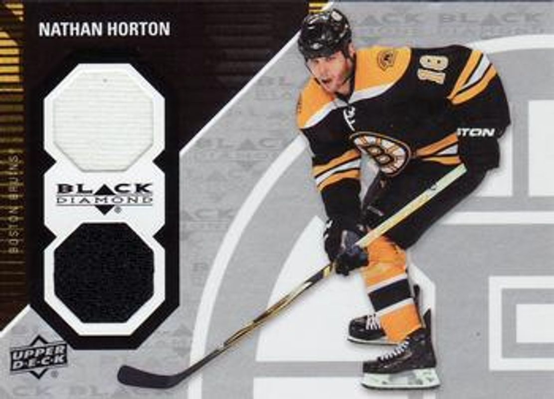 The Nathan Horton 2011 Upper Deck Black Diamond #BOS-NH Dual Jerseys card is 1 of 7 Nathan Horton's card variations in the 2011 Upper Deck Black Diamond set being tracked by Sports Card Investor, including Base, Ruby /100, Gold /10, Platinum /1, and Boston Bruins Championship Rings.