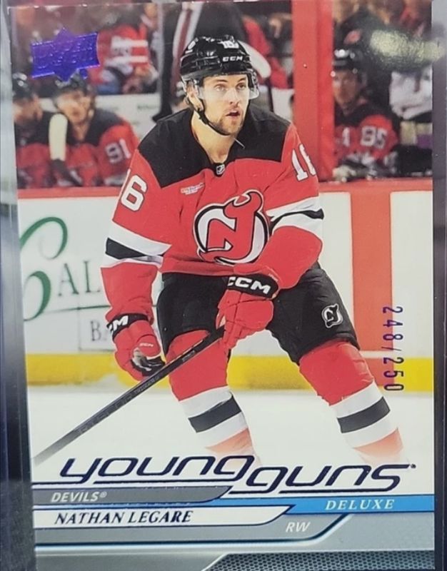 The Nathan Legare 2024 Upper Deck Extended Series #717 Deluxe /250 Rookie card is 1 of 27 Nathan Legare's card variations in the 2024 Upper Deck Extended Series set being tracked by Sports Card Investor, including Base, Young Guns Base, Clear Cut, Outburst, and Young Guns - Clear Cut.