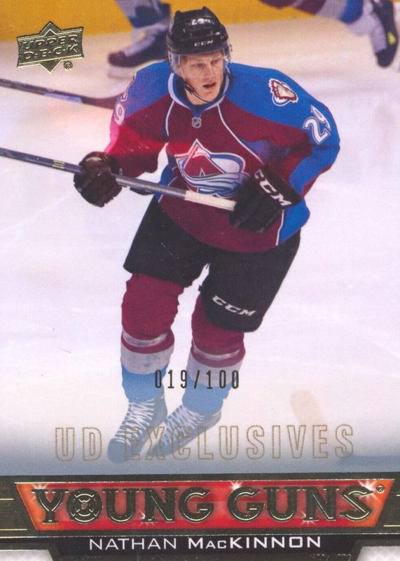 The Nathan MacKinnon 2013 Upper Deck #238 Young Guns - UD Exclusives /100 Rookie card in Raw condition has not changed in price in the last 30 days and was last sold for $1,497.73 .
