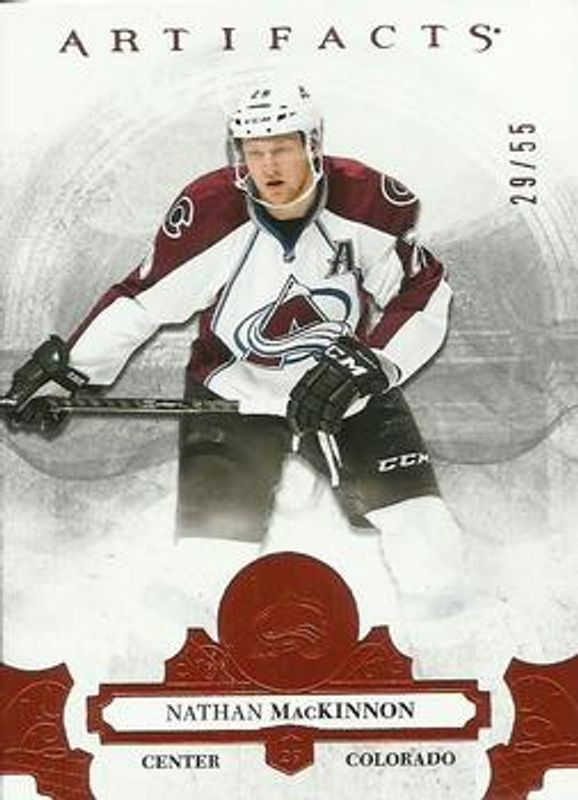 The Nathan MacKinnon 2017 Upper Deck Artifacts #60 Orange /55 card is 1 of 13 Nathan MacKinnon's card variations in the 2017 Upper Deck Artifacts set being tracked by Sports Card Investor, including Base /799, Materials Silver /125, Auto Material Silver /99, Emerald /99, and Auto Material Emerald /25.