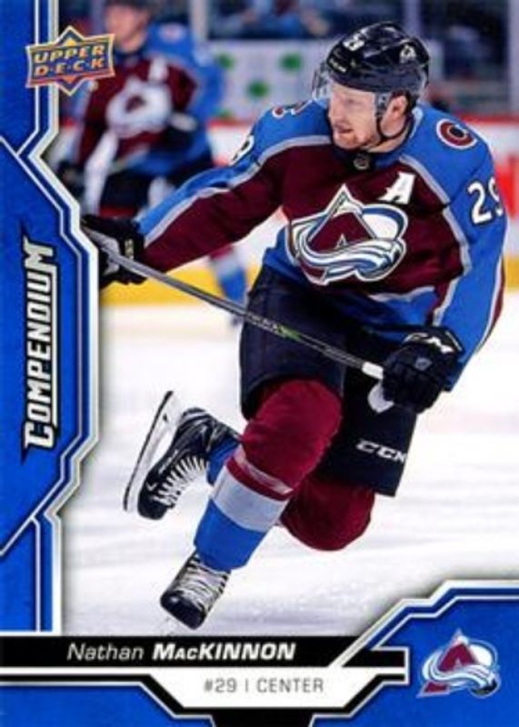 The Nathan MacKinnon 2018 Upper Deck Compendium #SP2 Blue Parallel SP Achievement card is 1 of 10 Nathan MacKinnon's card variations in the 2018 Upper Deck Compendium set being tracked by Sports Card Investor, including Blue, Gold, Printing Plates Black /1, Printing Plates Cyan /1, and Printing Plates Magenta /1.