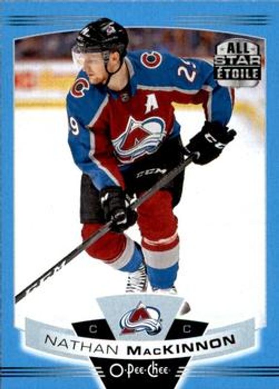 The Nathan MacKinnon 2019 O-Pee-Chee #430 Blue Border card is 1 of 16 Nathan MacKinnon's card variations in the 2019 O-Pee-Chee set being tracked by Sports Card Investor, including #430b Base, #430 Base, #430 Gold Border, #430 Red Border, and #430 Red Border Blank Back.