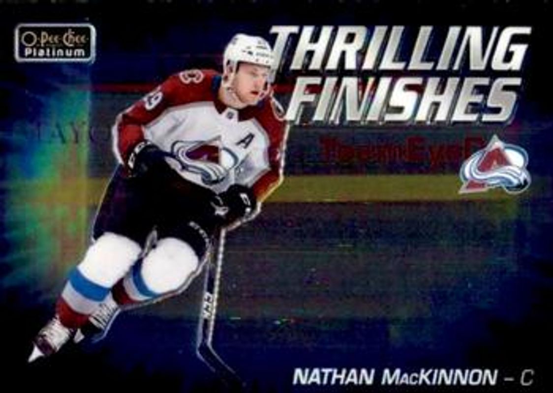 The Nathan MacKinnon 2019 O-Pee-Chee Platinum #TF-9 Thrilling Finishes card is 1 of 25 Nathan MacKinnon's card variations in the 2019 O-Pee-Chee Platinum set being tracked by Sports Card Investor, including #75b Base, #75 Base, #75 Matte Pink, #75 Pond Hockey, and #75 Rainbow.