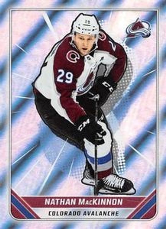 The Nathan MacKinnon 2019 Topps Stickers #122 Base card is 1 of 3 Nathan MacKinnon's card variations in the 2019 Topps Stickers set being tracked by Sports Card Investor, including #120 Base, and #132 Base.