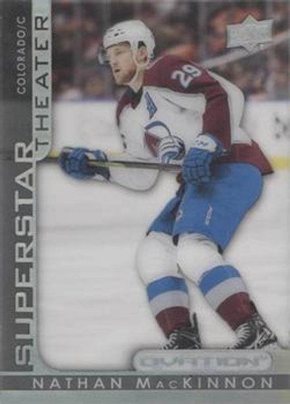 The Nathan MacKinnon 2021 Upper Deck Ovation #ST-32 Superstar Theater card is 1 of 20 Nathan MacKinnon's card variations in the 2021 Upper Deck Ovation set being tracked by Sports Card Investor, including Base, Checkerboard, Gold Circular Wonder, Gold Foil, and Silver Foil.