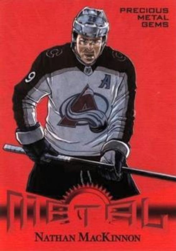 The Nathan MacKinnon 2022 Metal Universe #RT-15 2013 Retro - Precious Metal Gems Red /100 card is 1 of 32 Nathan MacKinnon's card variations in the 2022 Metal Universe set being tracked by Sports Card Investor, including Base, Spectrum FX Blue, Spectrum FX Purple /199, Precious Metal Gems Green /100, and Precious Metal Gems Red /100.