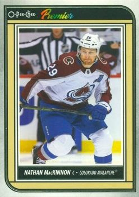 The Nathan MacKinnon 2022 O-Pee-Chee #P-8 O-Pee-Chee - Premier card is 1 of 22 Nathan MacKinnon's card variations in the 2022 O-Pee-Chee set being tracked by Sports Card Investor, including #17 Base, #17b Base, #17 Blue Border, #17 Red Border, and #17 Retro.