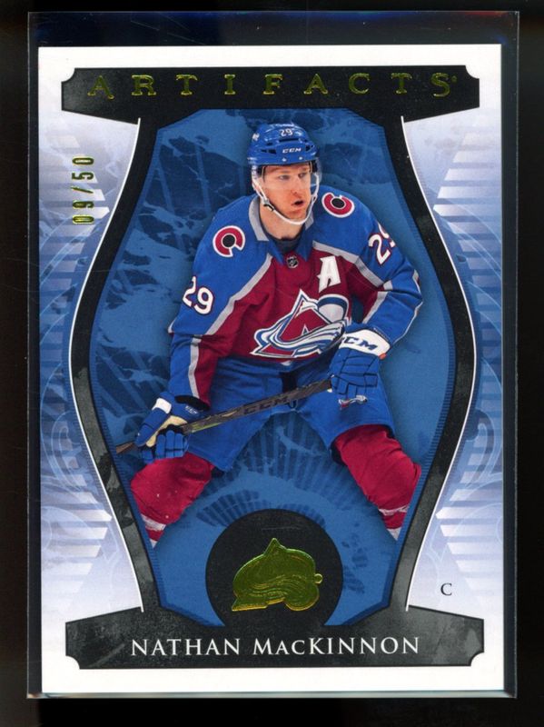 The Nathan MacKinnon 2023 Upper Deck Artifacts #10 Yellow /50 card is 1 of 24 Nathan MacKinnon's card variations in the 2023 Upper Deck Artifacts set being tracked by Sports Card Investor, including Base /999, Turquoise, Ruby /499, Copper /299, and Royal Blue /199.