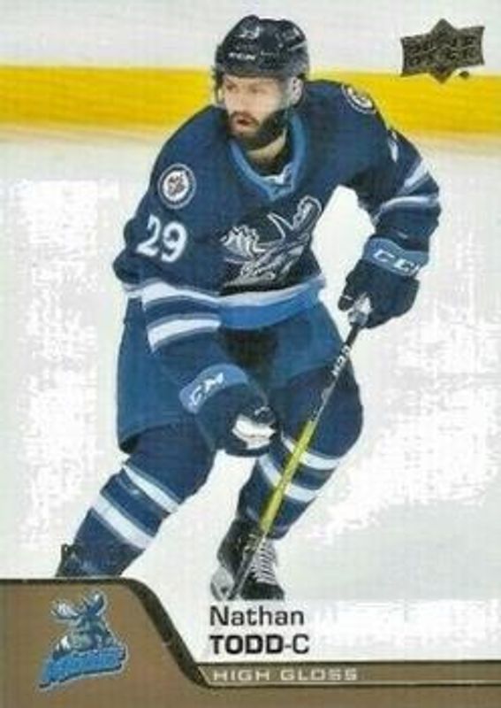 The Nathan Todd 2020 Upper Deck AHL #2 UD High Gloss /10 card is 1 of 8 Nathan Todd's card variations in the 2020 Upper Deck AHL set being tracked by Sports Card Investor, including Base, UD Exclusives /100, Blue, Printing Plates Black /1, and Printing Plates Cyan /1.