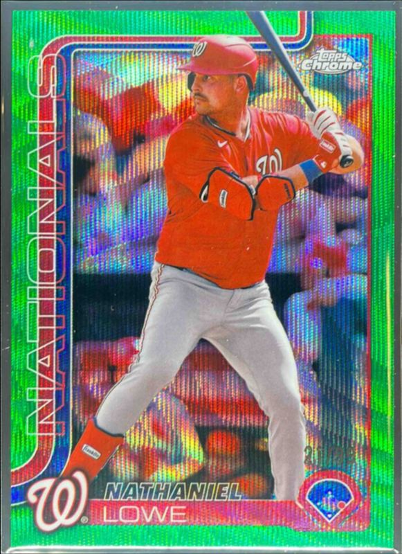 The Nathaniel Lowe 2025 Topps Chrome #49 Green Wave Refractor /99 card is 1 of 51 Nathaniel Lowe's card variations in the 2025 Topps Chrome set being tracked by Sports Card Investor, including Base, Geometric Refractor, Lightboard Logo Variation, Negative Refractor, and Prism Refractor.
