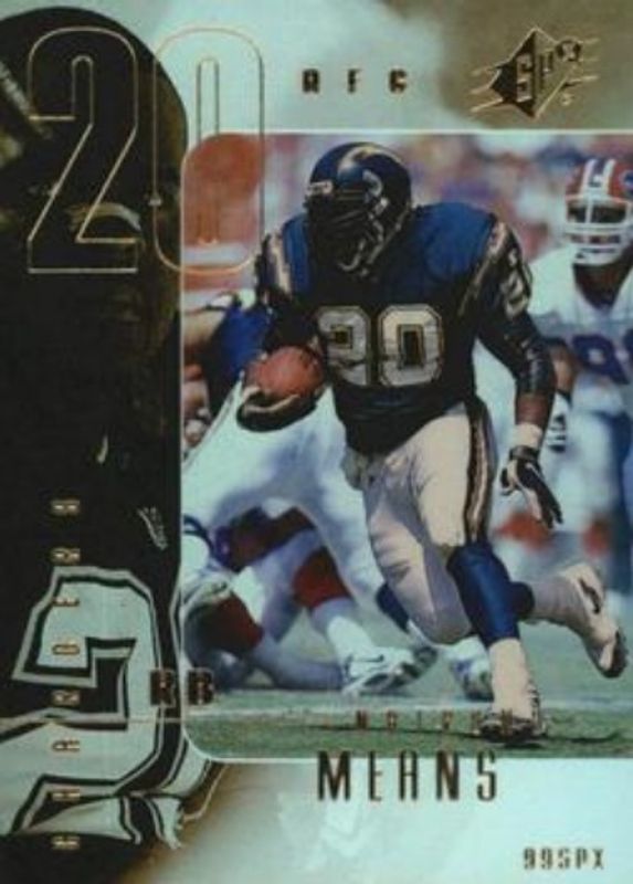 The Natrone Means 1999 SPx #74 Base /1999 card is 1 of 3 Natrone Means' card variations in the 1999 SPx set being tracked by Sports Card Investor, including Radiance /100, and Spectrum /1.