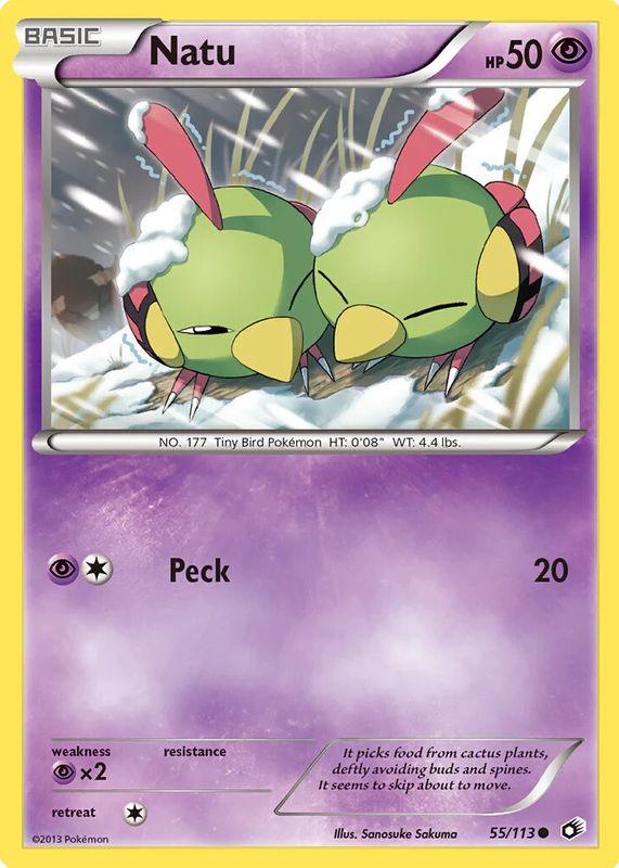 The Natu 2013 Black & White: Legendary Treasures #055/113 Base card in Raw TCG (Near Mint) condition has not changed in price in the last 30 days and was last sold for $1.50 .