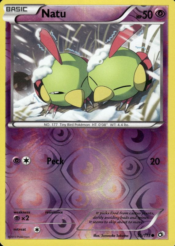 The Natu 2013 Black & White: Legendary Treasures #055/113 Reverse Holo card in Raw TCG (Near Mint) condition has moved up $2.61 (+52.3%) in the last 30 days and was last sold for $7.60 .