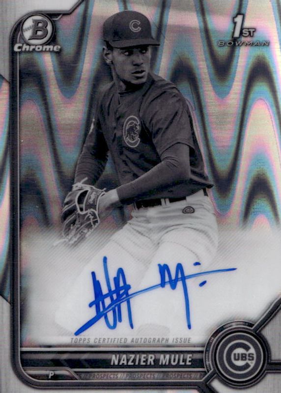 The Nazier Mule 2022 Bowman Draft #CDA-NME Chrome DP Auto - Black & White RayWave Refractor (1st) card in Raw condition has not changed in price in the last 30 days and was last sold for $82.00 .