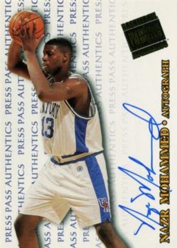 The Nazr Mohammed 1998 Press Pass Authentics Autographs Rookie card is 1 of 5 Nazr Mohammed's card variations in the 1998 Press Pass Authentics set being tracked by Sports Card Investor, including Base, Hang Time, Full Court Press, and Signed Memorabilia.