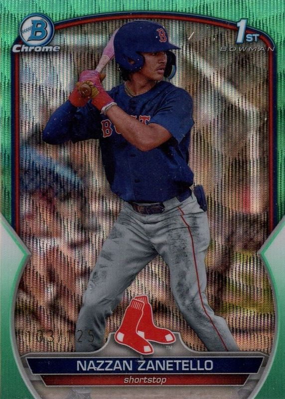 The Nazzan Zanetello 2023 Bowman Draft #BDC-3 Chrome - Aqua Wave Refractor /125 (1st) card in Raw condition has not changed in price in the last 30 days and was last sold for $3.60 .
