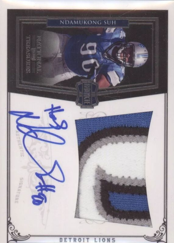 This card is 1 of 3 Ndamukong Suh's card variations in the 2010 National Treasures set being tracked by Sports Card Investor, including Rookie Patch Auto - Gold /25, and Rookie Patch Auto - Platinum /5.