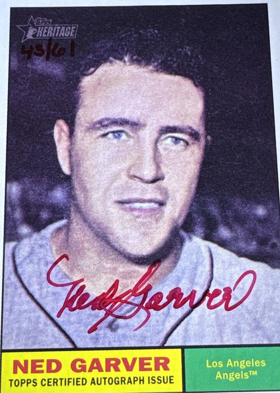 The Ned Garver 2010 Topps Heritage #ROA-NG Real One Autographs - Red Ink /61 card in Raw condition has not changed in price in the last 30 days and was last sold for $18.50 .