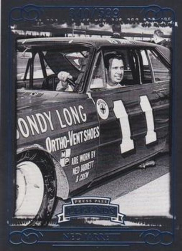 The Ned Jarrett 2008 Press Pass Legends #16 Blue /599 card is 1 of 24 Ned Jarrett's card variations in the 2008 Press Pass Legends set being tracked by Sports Card Investor, including Base, Bronze /299, Gold /99, Holo /25, and eBay Previews Red /5.
