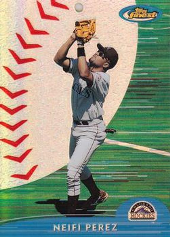 The Neifi Perez 2000 Topps Finest #210 Refractor /1000 card is 1 of 3 Neifi Perez's card variations in the 2000 Topps Finest set being tracked by Sports Card Investor, including Base, and Gold Refractor /100.