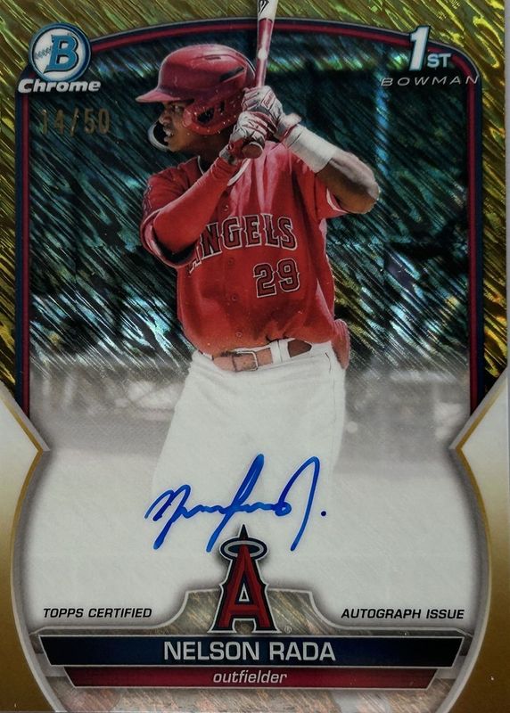The Nelson Rada 2023 Bowman #CPA-NR Chrome Prospect Auto - Gold Shimmer Refractor /50 (1st) card in Raw condition has not changed in price in the last 30 days and was last sold for $248.50 .