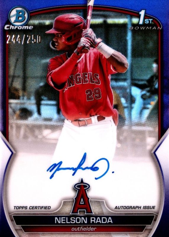 The Nelson Rada 2023 Bowman #CPA-NR Chrome Prospect Auto - Purple Refractor /250 (1st) card in Raw condition has not changed in price in the last 30 days and was last sold for $50.00 .