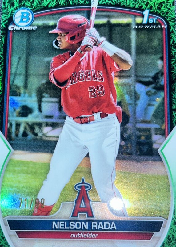 The Nelson Rada 2023 Bowman #BCP-132 Chrome Prospects - Green Grass Refractor /99 (1st) card in Raw condition has not changed in price in the last 30 days and was last sold for $24.68 .