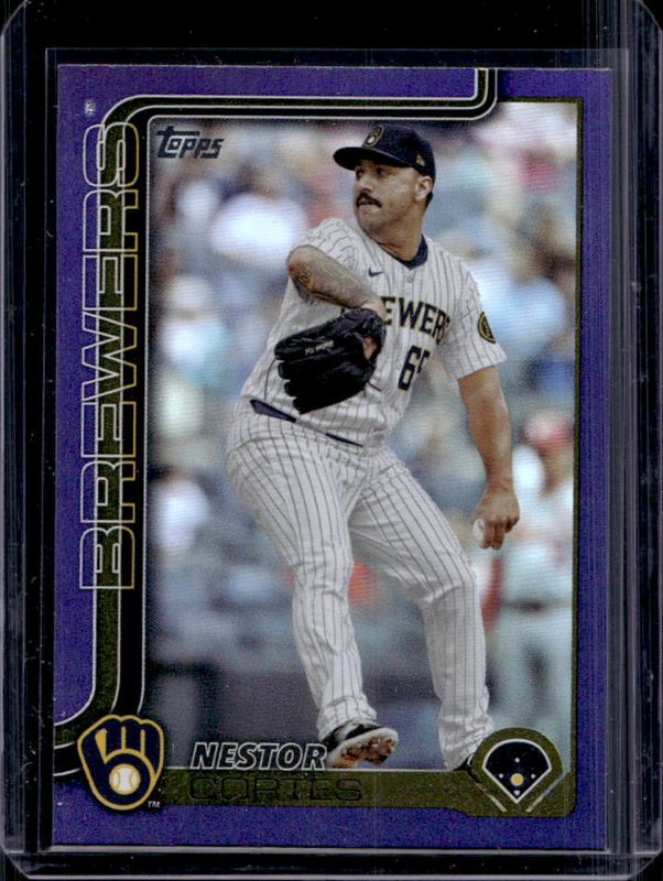 The Nestor Cortes Jr. 2025 Topps #604 Purple Rainbow /250 card is 1 of 74 Nestor Cortes Jr.'s card variations in the 2025 Topps set being tracked by Sports Card Investor, including Base, Aqua Holo Foil, Diamante Foil, Holo Foil, and Pink Diamante Foil.