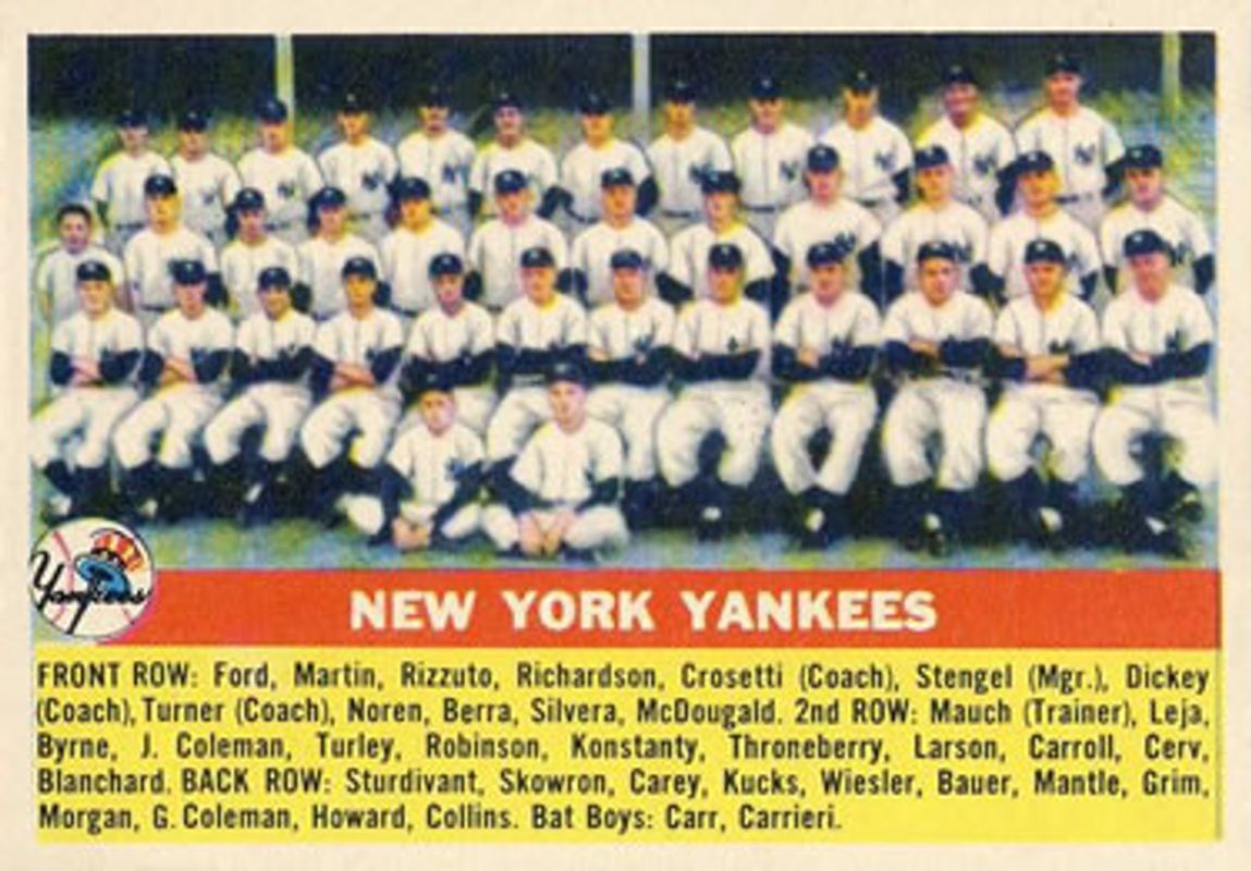 The New York Yankees 1956 Topps #251 Base card is 1 of 2 New York Yankees' card variations in the 1956 Topps set being tracked by Sports Card Investor, including Felt Team Emblems.