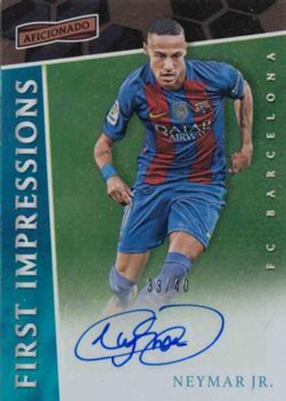 The Neymar Jr. 2016 Aficionado #FI-N First Impressions /40 card is 1 of 34 Neymar Jr.'s card variations in the 2016 Aficionado set being tracked by Sports Card Investor, including #77 Base, #156 Base, #156 Artist's Proof, #77 Artist's Proof, and #77 First Kick.