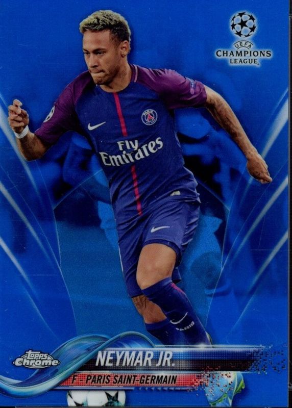 The Neymar Jr. 2017 Topps Chrome UEFA Champions League #50 Blue Refractor /150 card in Raw condition has not changed in price in the last 30 days and was last sold for $107.50 .